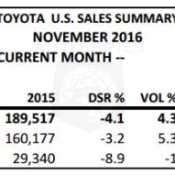 Toyota Motor Sales (TMS), U.S.A., Inc., today reported November 2016 sales...