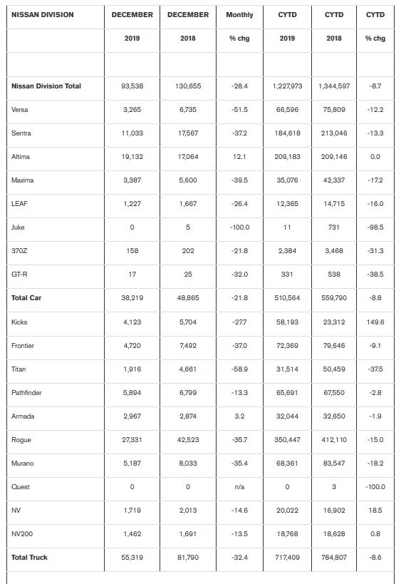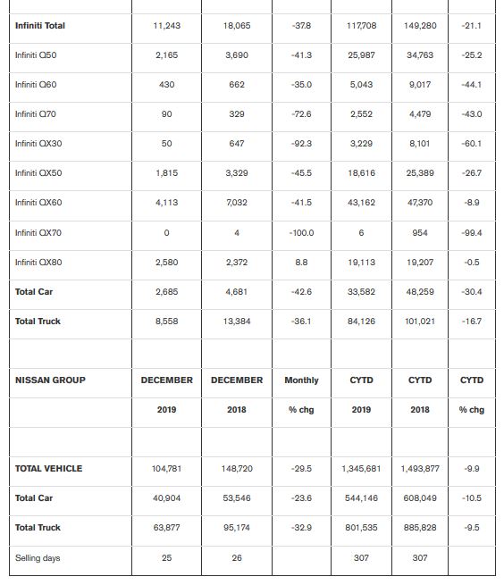 Nissan Group announced total U.S. sales for December 2019 of 104,781 units, a decrease of 29.5 percent versus the prior year. Nissan Group also announced total calendar year 2019 U.S. sales of 1,345,681 units, a decrease of 9.9 percent compared to the prior year.