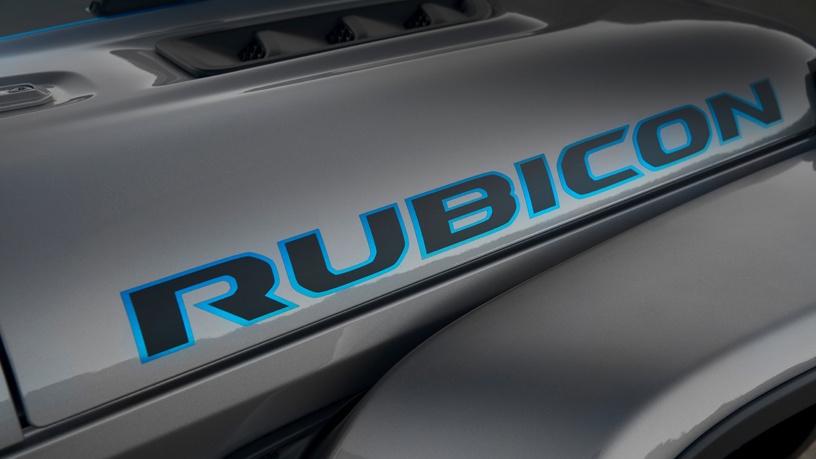 Exclusive content identifies the Jeep Wrangler 4xe as the most technologically advanced Wrangler ever. New Electric Blue coloring on the front and rear Rubicon tow hooks stands out against the black bumpers. The unique blue coloring also traces the Rubicon name on the hood, Jeep badge and the Trail Rated badge. Select Easter egg design cues also receive the Electric Blue shade. The black hood decal is outlined in the special color with “4xe” that lets the body color show through.