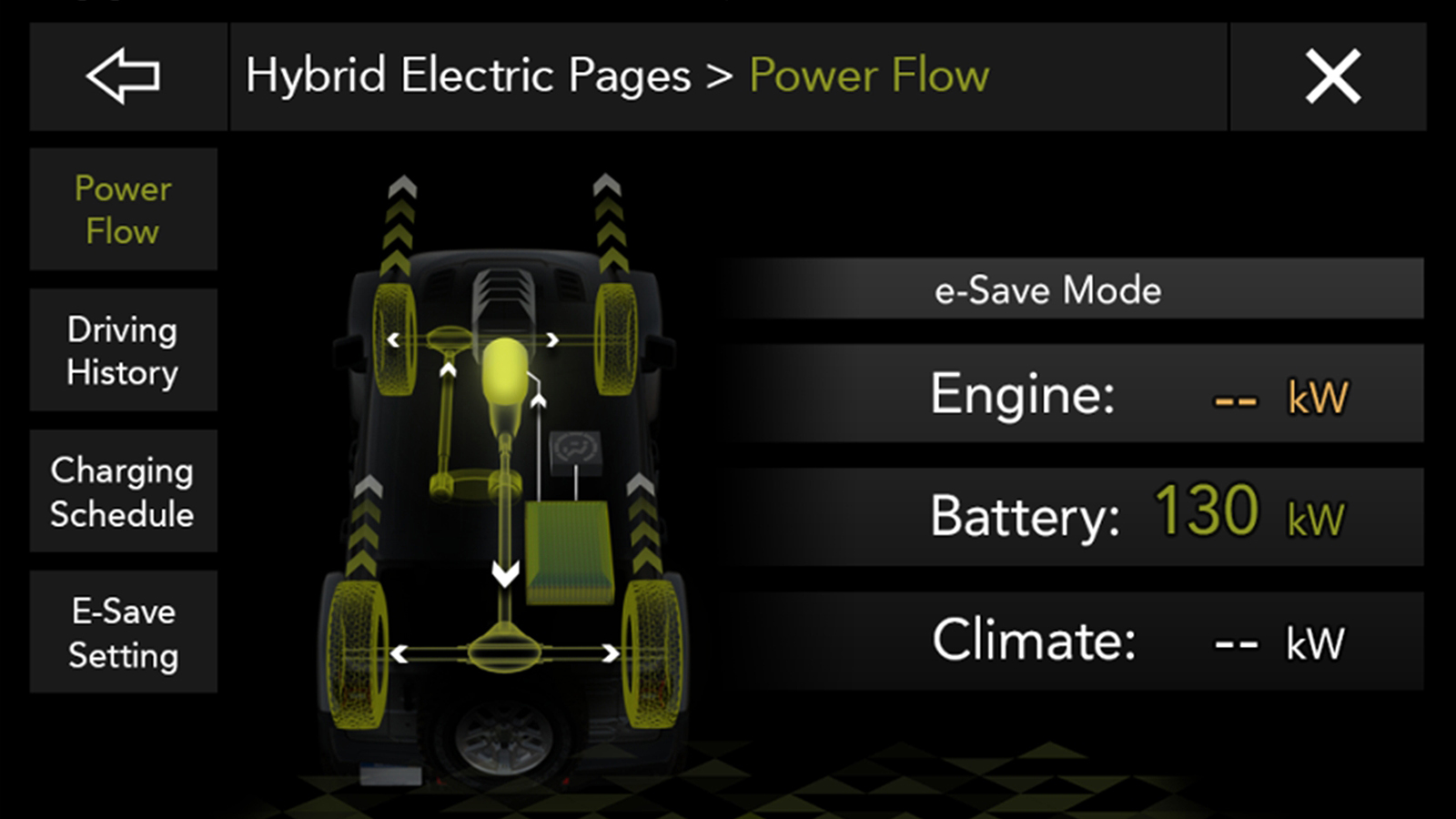 - eSave: Prioritizes propulsion from the 2.0-liter engine, saving the battery charge for later use, such as EV off-roading or urban areas where internal combustion propulsion is restricted. The driver can also choose between Battery Save and Battery Charge during eSave via the Hybrid Electric Pages in the Uconnect monitor