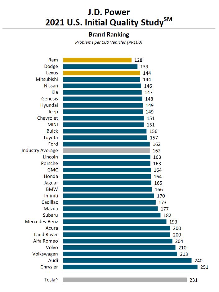 Ram is the highest-ranking brand in overall initial quality for the first time, with a score of 128 PP100.