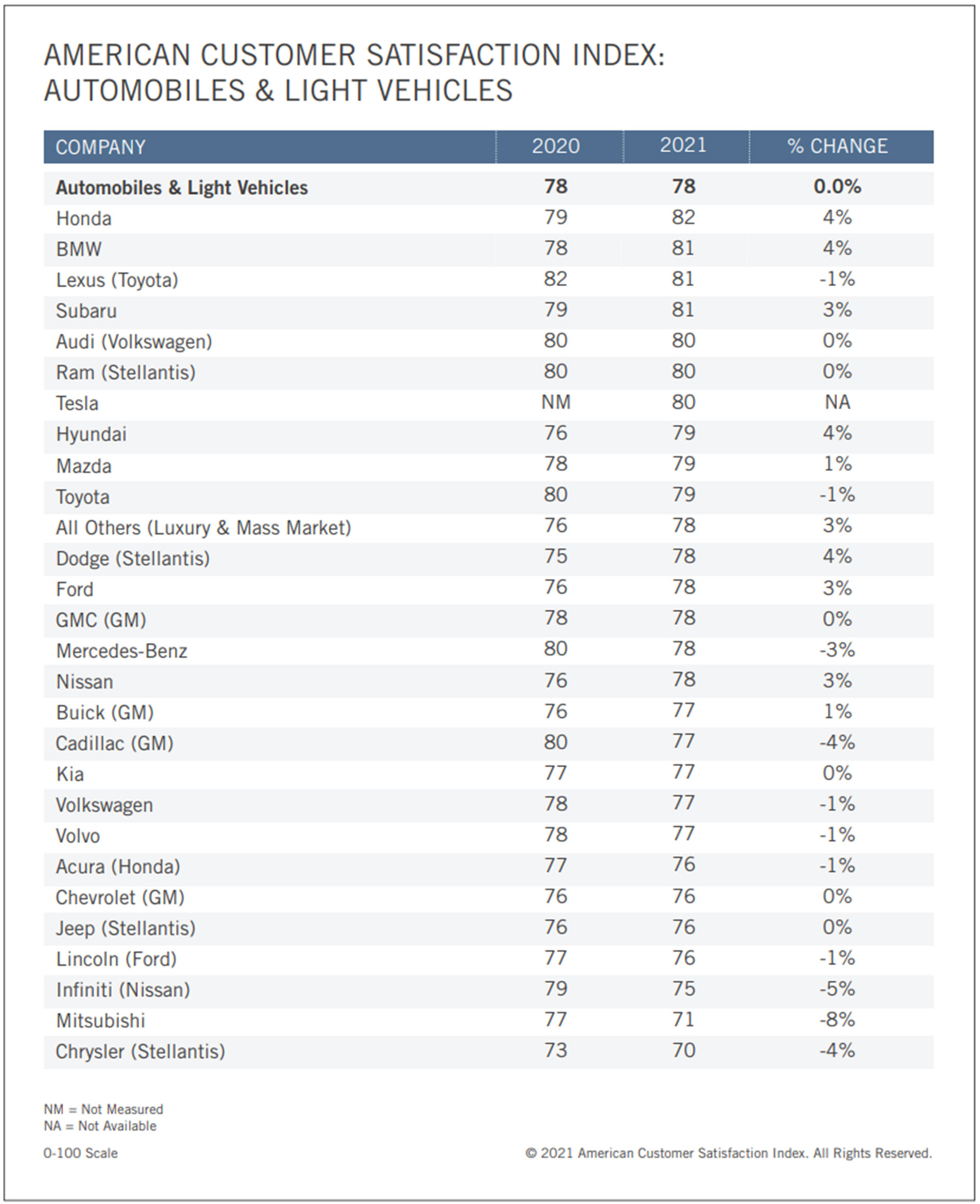 The ACSI Automobile Study 2020-2021 was put together based on interviews with 4,888 customers chosen at random and contacted via email between July 6, 2020 and June 28, 2021. Customers were asked to evaluate their recent experiences with major automotive brands. Results are based on a 0-100 scale.