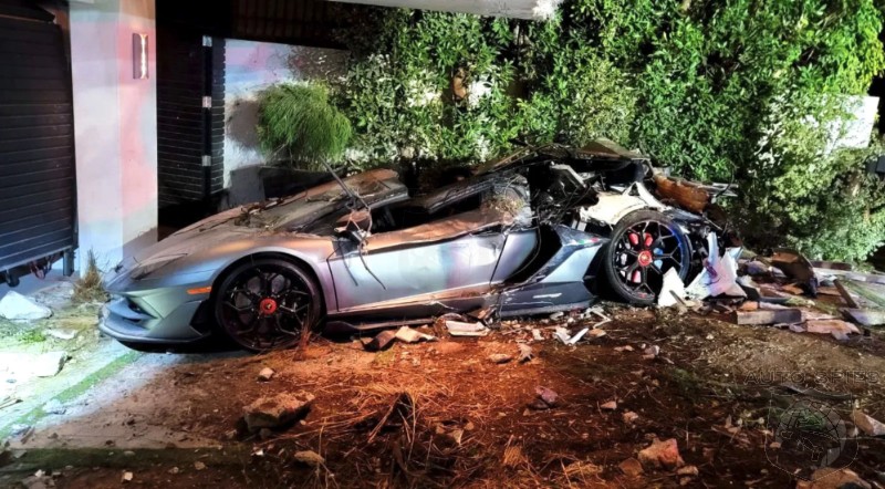 The accident scene, sadly, was the owner’s Beverly Hills driveway in which an apparently custom Lamborghini Aventador and a Bentley (presumably a Continental but it’s so smooshed that it’s hard to know for sure) were crashed into by an errant delivery truck.