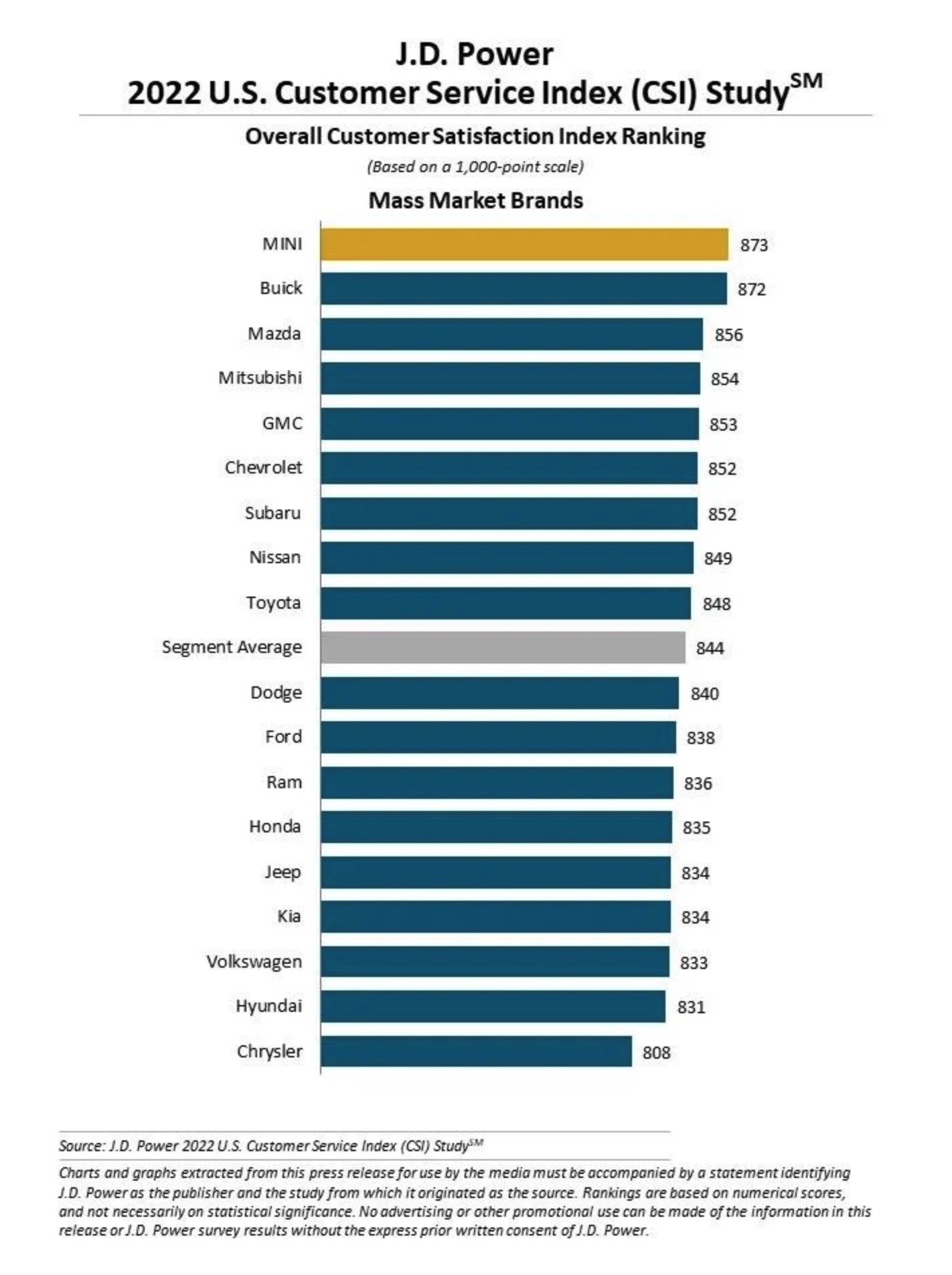 MINI ranks highest in satisfaction with dealer service among mass market brands for a second consecutive year, with a score of 873. Buick (872) ranks second, followed by Mazda (856), Mitsubishi (854) and GMC (853).