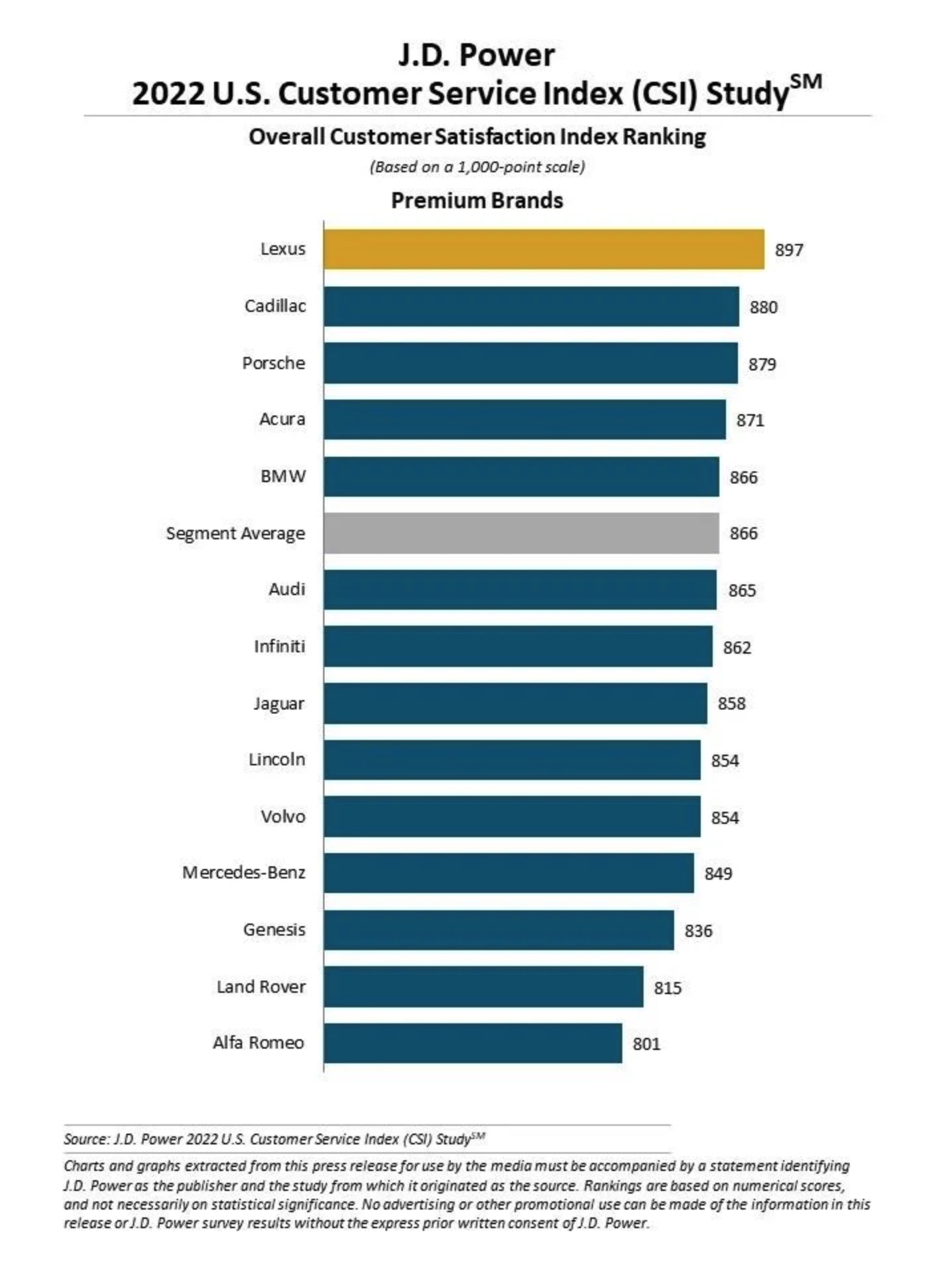 The 2022 U.S. Customer Service Index (CSI) Study is based on responses from 67,185 verified registered owners and lessees of 2019 to 2021 model-year vehicles. J.D. Power goes to great lengths to ensure that survey respondents are true owners of the brand they are representing. The study was fielded from July through December 2021.
