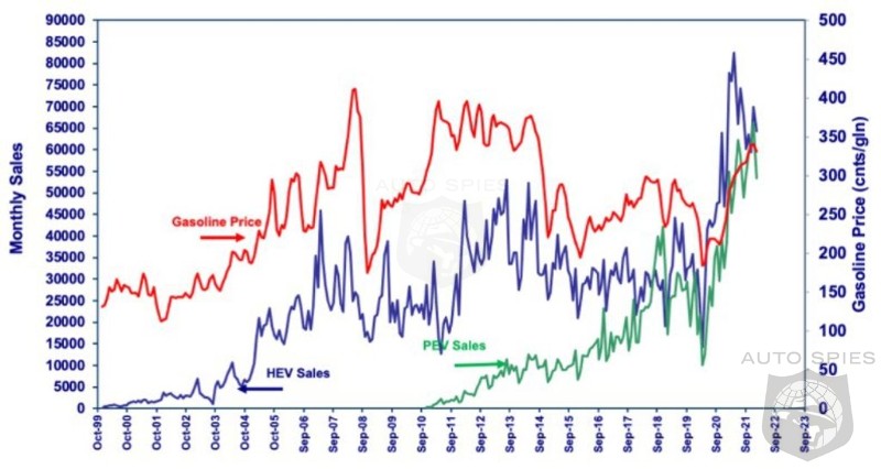 Take a look at this chart from EIA, which has been updated through January 2022. It compares hybrid and plug-in EV sales against gasoline prices.
