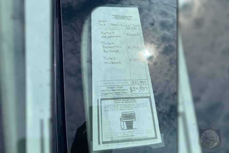 Yes, Arlington Heights Ford located northwest of Chicago currently has a $20,000 markup on a Maverick Lariat Hybrid, which would normally add up to $32,940. The total cost of the truck, including tinted windows and a “Triton Protection Package” the dealer added on is truly stunning: $54,934. Yes, you’re reading that right: Over fifty grand for Ford’s cheapest vehicle. Markups alone add 60% to the price of the pickup.