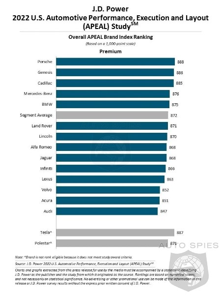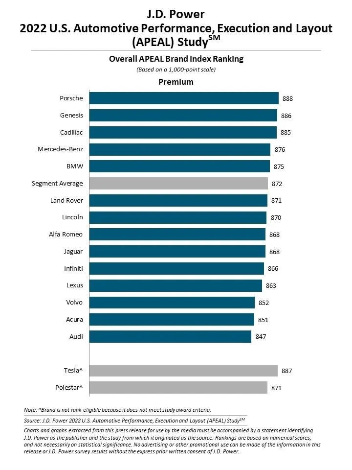 Porsche ranks highest among premium brands with a score of 888. Genesis (886) ranks second and Cadillac (885) ranks third among premium brands.