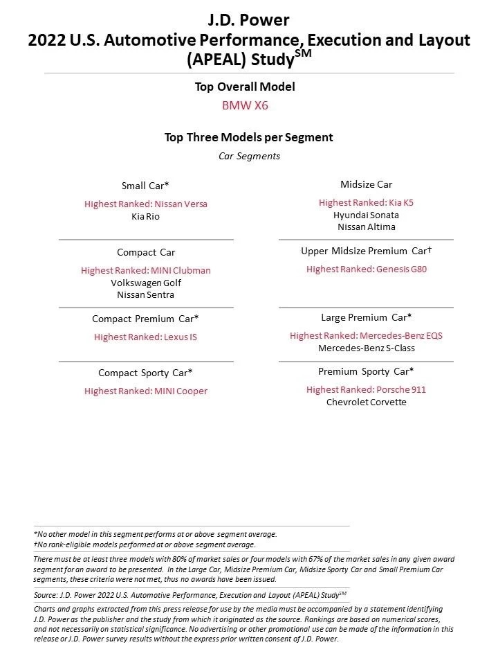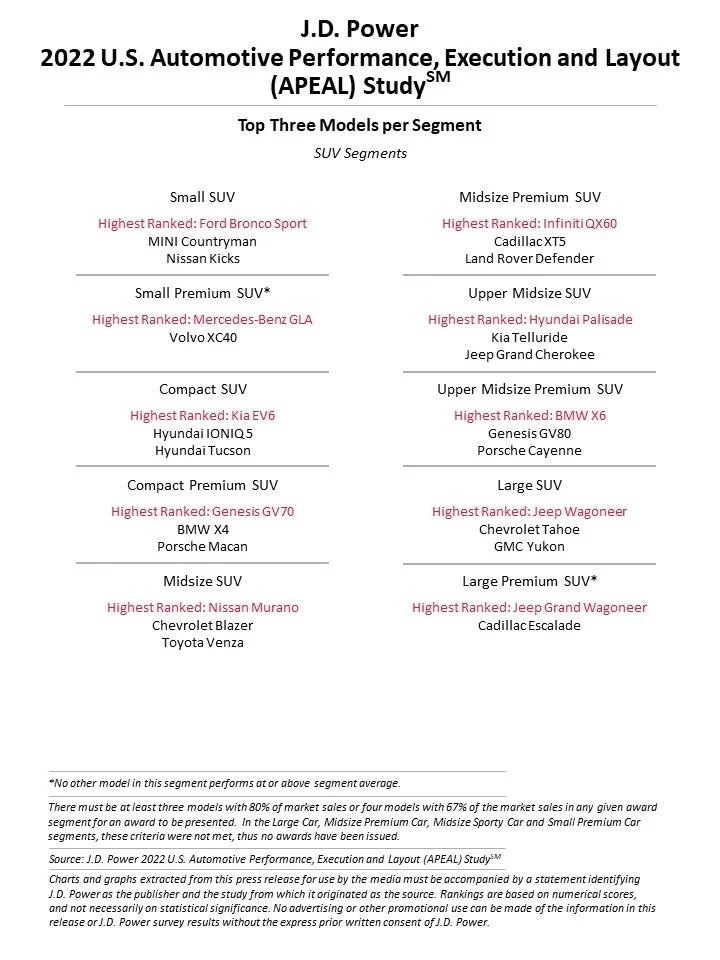 The 2022 U.S. APEAL Study is based on responses from 84,165 owners of new 2022 model-year vehicles who were surveyed after 90 days of ownership. The study was fielded from February 2022 through May 2022, based on vehicles registered from November 2021 through February 2022.