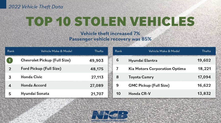 Hyundai and Kia were a hit with thieves last year, but a new study from the National Insurance Crime Bureau reveals full-size pickups were the hottest vehicles of 2022.