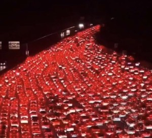 The traffic jam built up near a massive toll plaza outside Beijing, where dozens of lanes from toll booths merge back into the main highway, known as a ’50-lane highway’. These pictures will cause stress just looking at them.