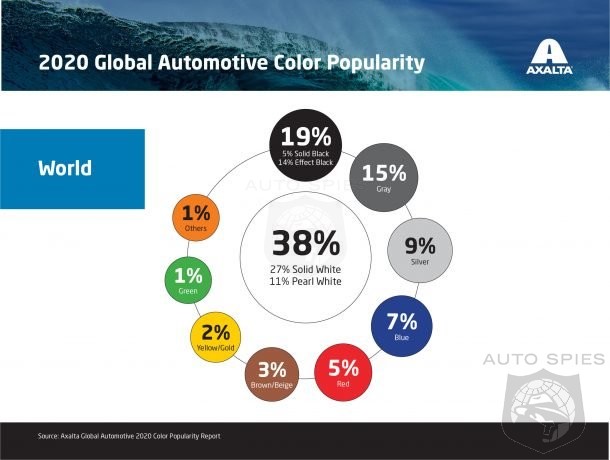 Axalta released its 68th Global Automotive Color Popularity Report today, and it said 81 percent of vehicles are white, black, gray or silver. White at 38 percent is the most frequently purchased automotive color worldwide and has been for 10 years consecutively. Black remains at 19 percent year-over-year and is a luxury vehicle favorite. Gray, at 15 percent, is up two percent and is at a 10-year high. Meanwhile, silver is in decline in all regions, now at just nine percent. This shift from silver to gray in many markets is its perception as a more modern and luxurious color.