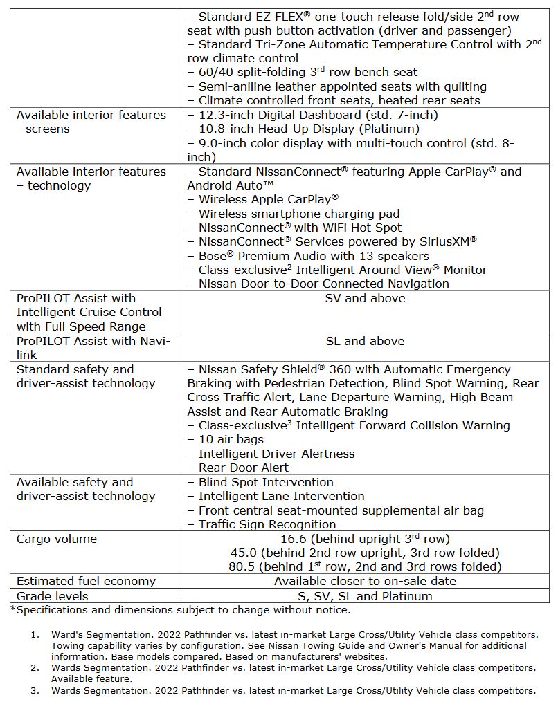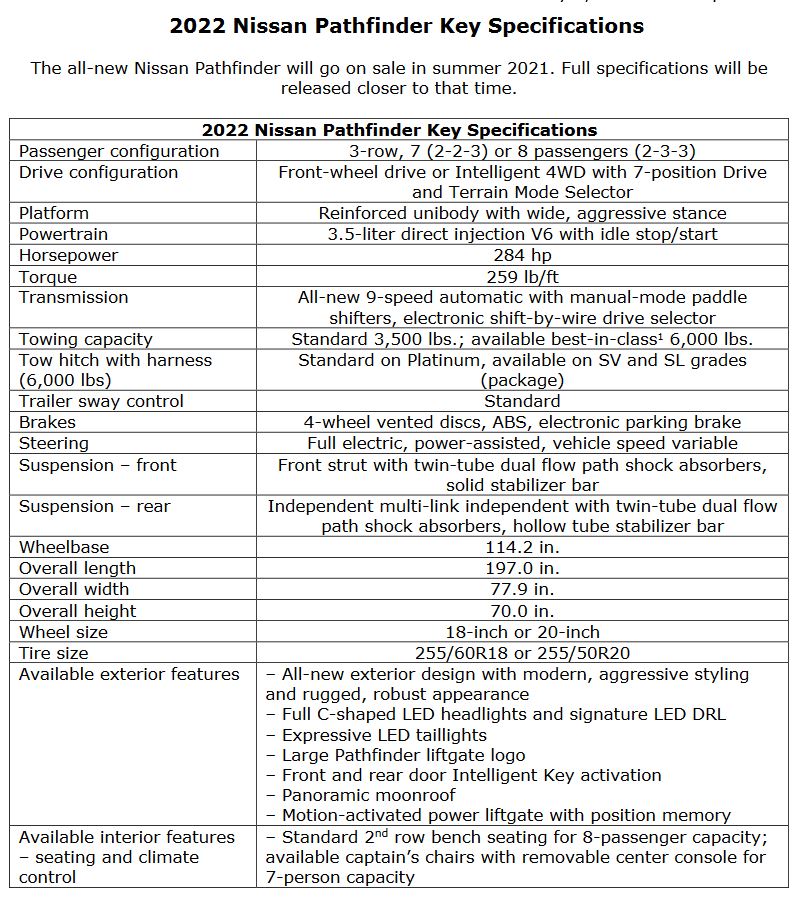 The all-new 2022 Pathfinder is offered in 2WD and 4WD and in four well-equipped trim levels – S, SV, SL and Platinum. Two packages – SV Premium and SL Premium – are available. Additional details will be available closer to the vehicle's summer 2021 on-sale date.