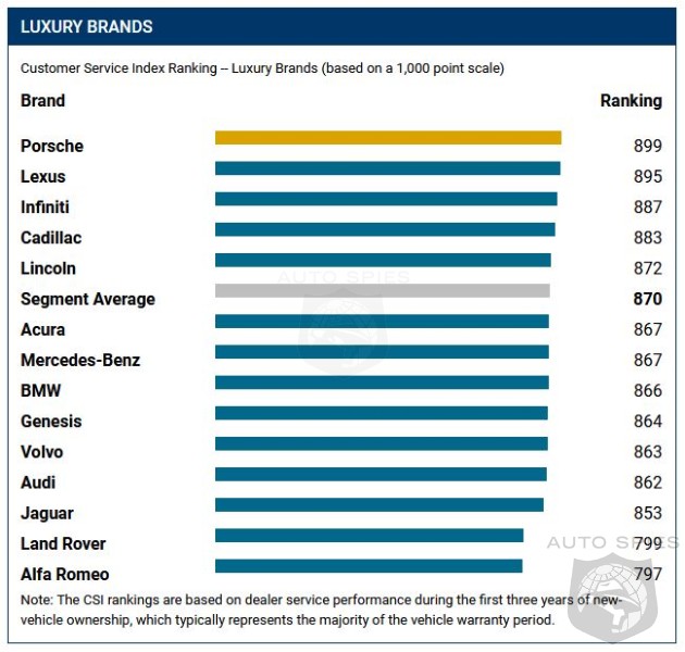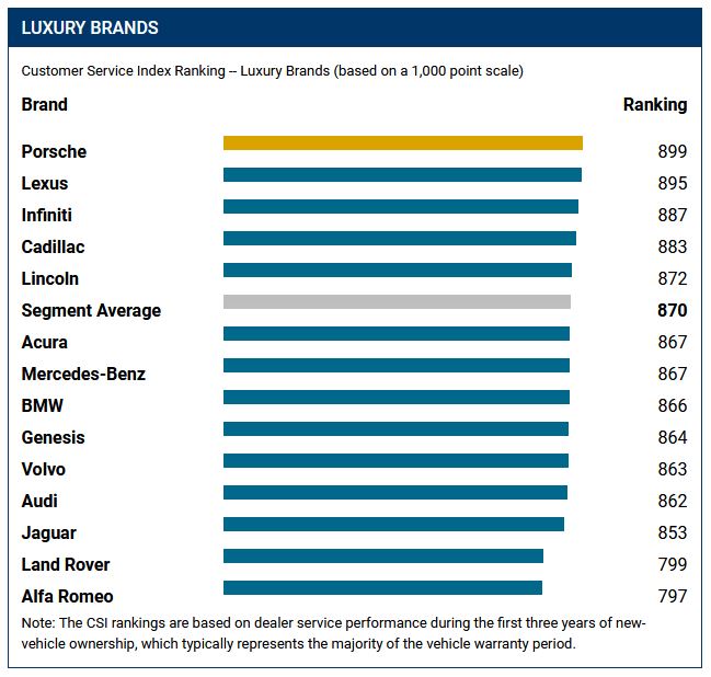 Porsche ranks highest in satisfaction with dealer service among premium brands with a score of 899. Lexus (895) ranks second, followed by Infiniti (887), Cadillac (883) and Lincoln (872).