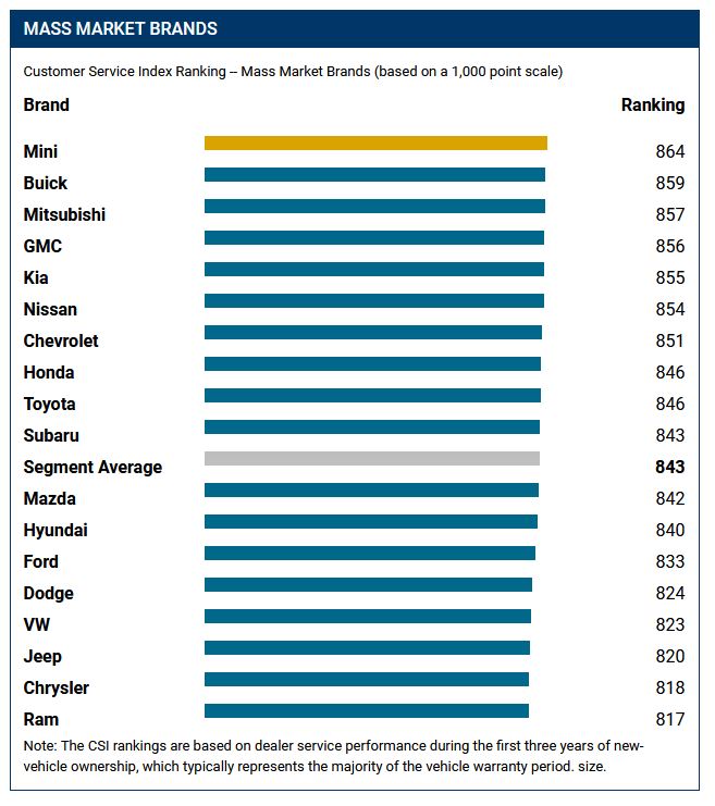 MINI ranks highest in satisfaction with dealer service among mass market brands, with a score of 864. Buick (859) ranks second, followed by Mitsubishi (857), GMC (856) and Kia (855).