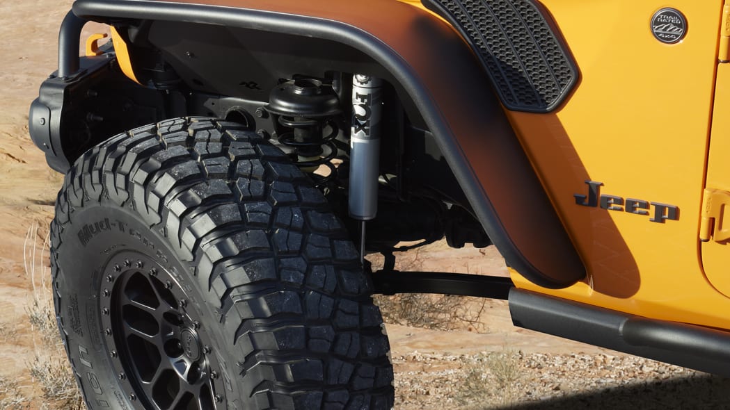 Off-road performance comes from the proven JPP 2-inch lift kit with FOX shocks that increases ground clearance. Just below the concept steel “high-top” fender flares are 17-inch JPP beadlock-capable aluminum wheels riding on 37-inch BF Goodrich KM3 mud-terrain tires with Mopar valve stem caps carrying the Jeep logo.