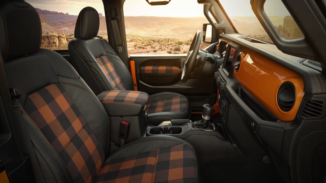 Enhancing the look is a Satin Black 360-degree custom beltline graphic and Satin Black vintage Jeep fender badges, which further highlight the eye-catching Orange Peelz exterior color.