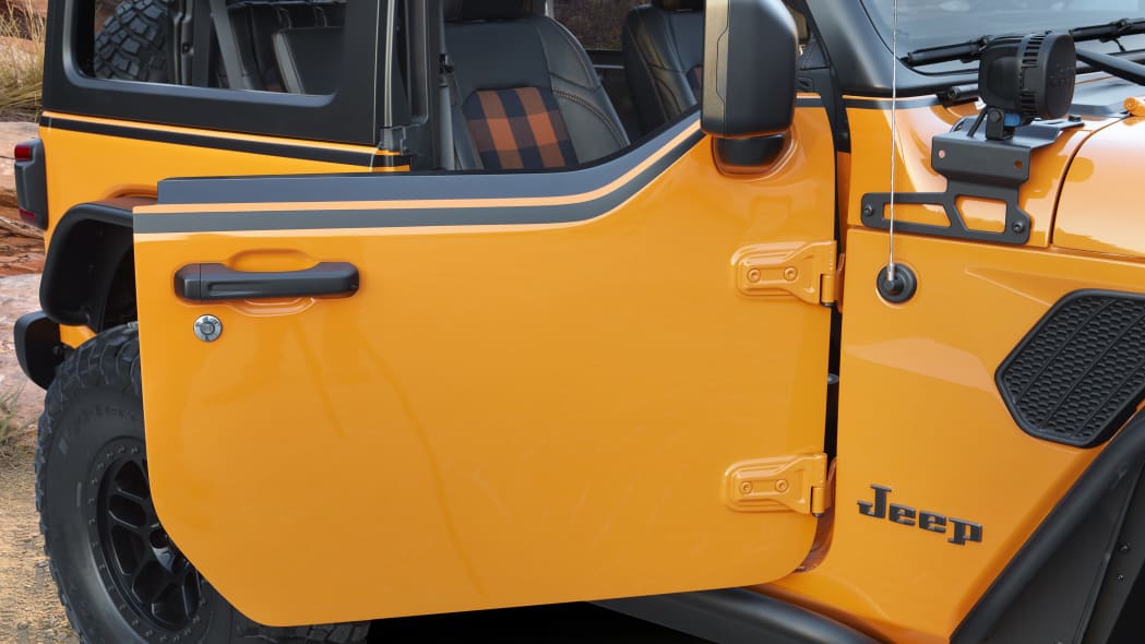 Mopar designers have vastly enhanced the Wrangler’s open-air heritage by removing side and rear windows, installing prototype JPP half doors and a custom removable one-piece Freedom Top glass sunroof.