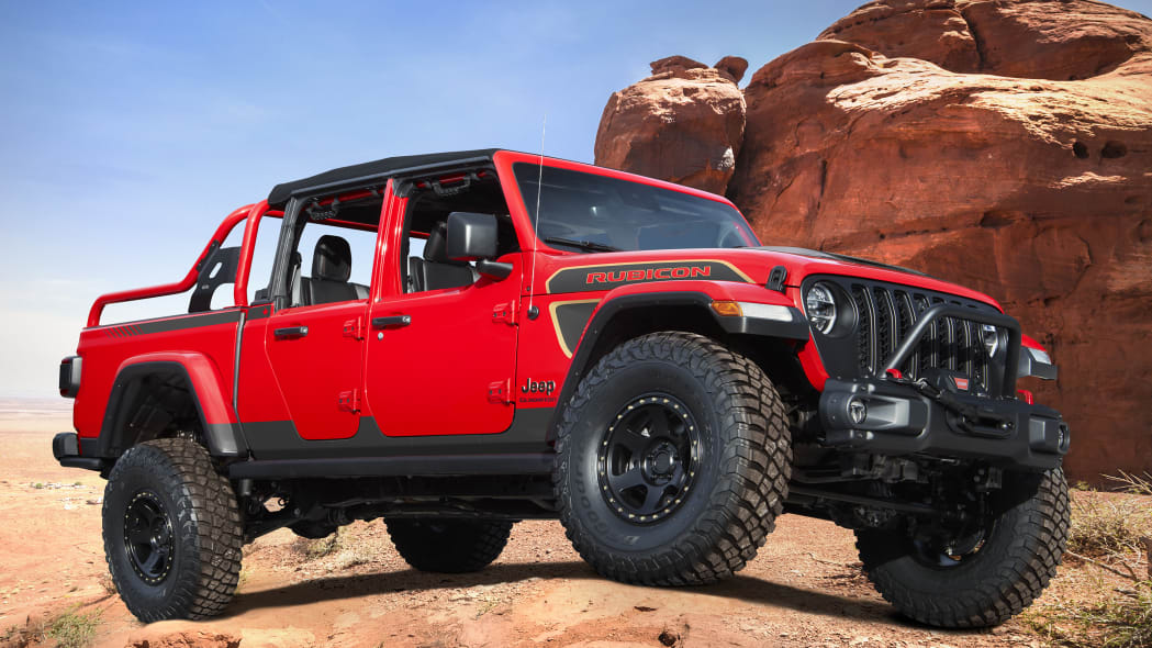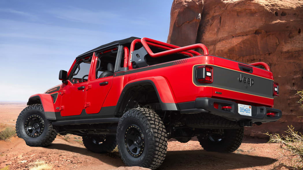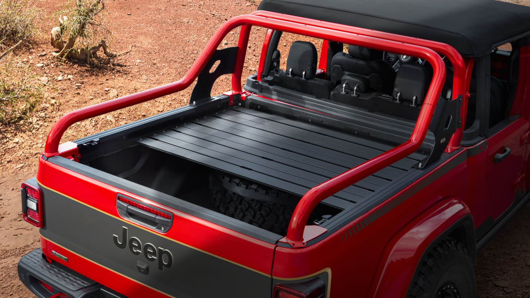 Tough terrain calls for an equally tough powertrain. The Jeep Red Bare Gladiator Rubicon concept builds upon a long-standing heritage of hardworking trucks, paired with legendary Jeep 4x4 capability to deliver ultimate performance, fuel efficiency and driving range.