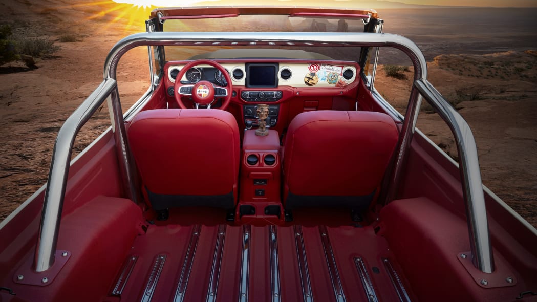 The Gladiator Red Bare concept also comes equipped with a JPP 2-inch lift kit, 17-inch Matte Black wheels with 37-inch BFG mud-terrain tires, cargo bed-mounted sport bar, JPP Sand Slider rock rails, bed cover and rack system, factory steel bumpers with a Warn winch and front bumper grille guard for added off-road protection.