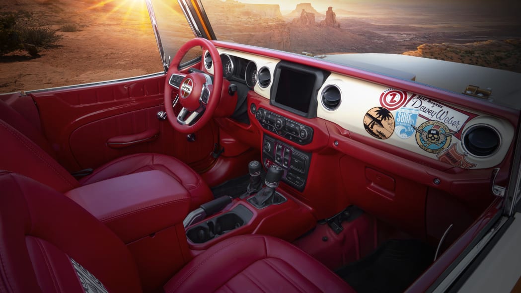 Jeepster Beach’s custom interior features low-back bucket seats trimmed in red leather. The rear seat was replaced with a chrome, four-point safety cage and the carpets were removed to make cleaning out sand a breeze.