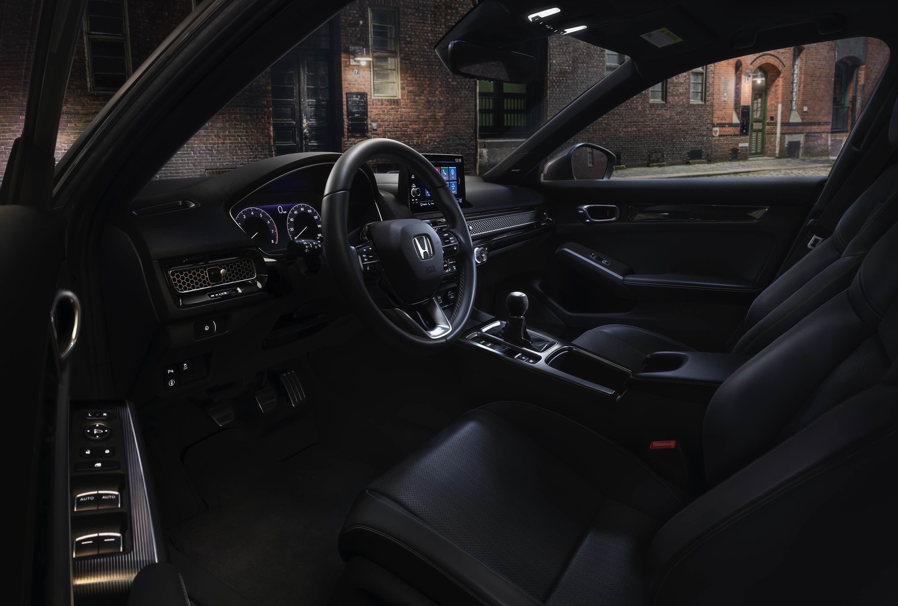 Also like the Civic Sedan, outward visibility is enhanced by Civic's pulled-back A-pillars, low hood, flat dashboard, low cowl and repositioned outside mirrors, which are now mounted on the doors. The instrument panel is designed with a minimum of cutlines to reduce windshield reflections and visual distractions, and the attractive new metal honeycomb instrument panel accent isn't just visually striking, it hides the air vents. Class-above materials are also used, especially on touchpoints, and careful attention has been paid to the premium action of all switchgear and controls.