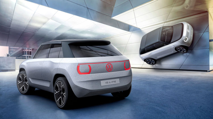 Pared-down design. The design of the ID. LIFE is strikingly clear, pared-down and high-quality. Decorative elements and add-on parts are dispensed with, as is any complex mix of materials. The horizontal division between the body, glass surfaces and roof also contributes to the car’s purist appearance. An individualised and removable roof made of air chamber textile lends an open-air feeling in the ID. LIFE, while also reducing the vehicle weight.