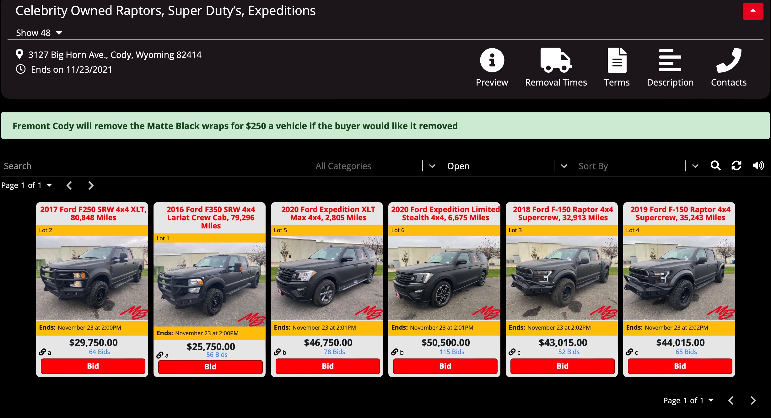 Up for auction are six Ford trucks: all matte black, all four-wheel drive.