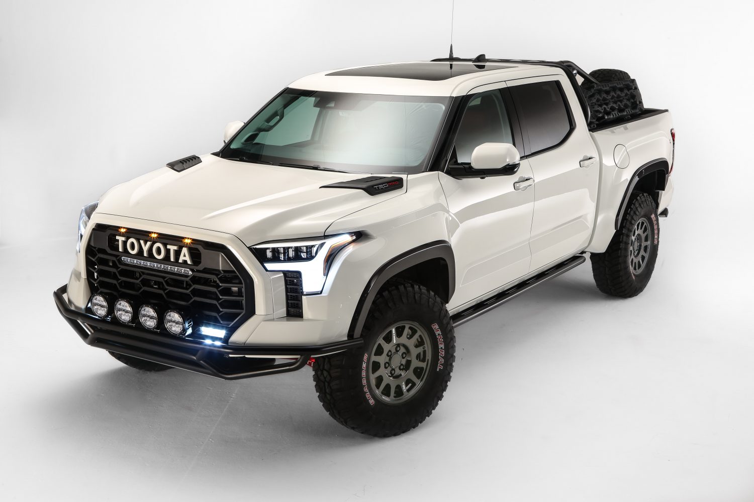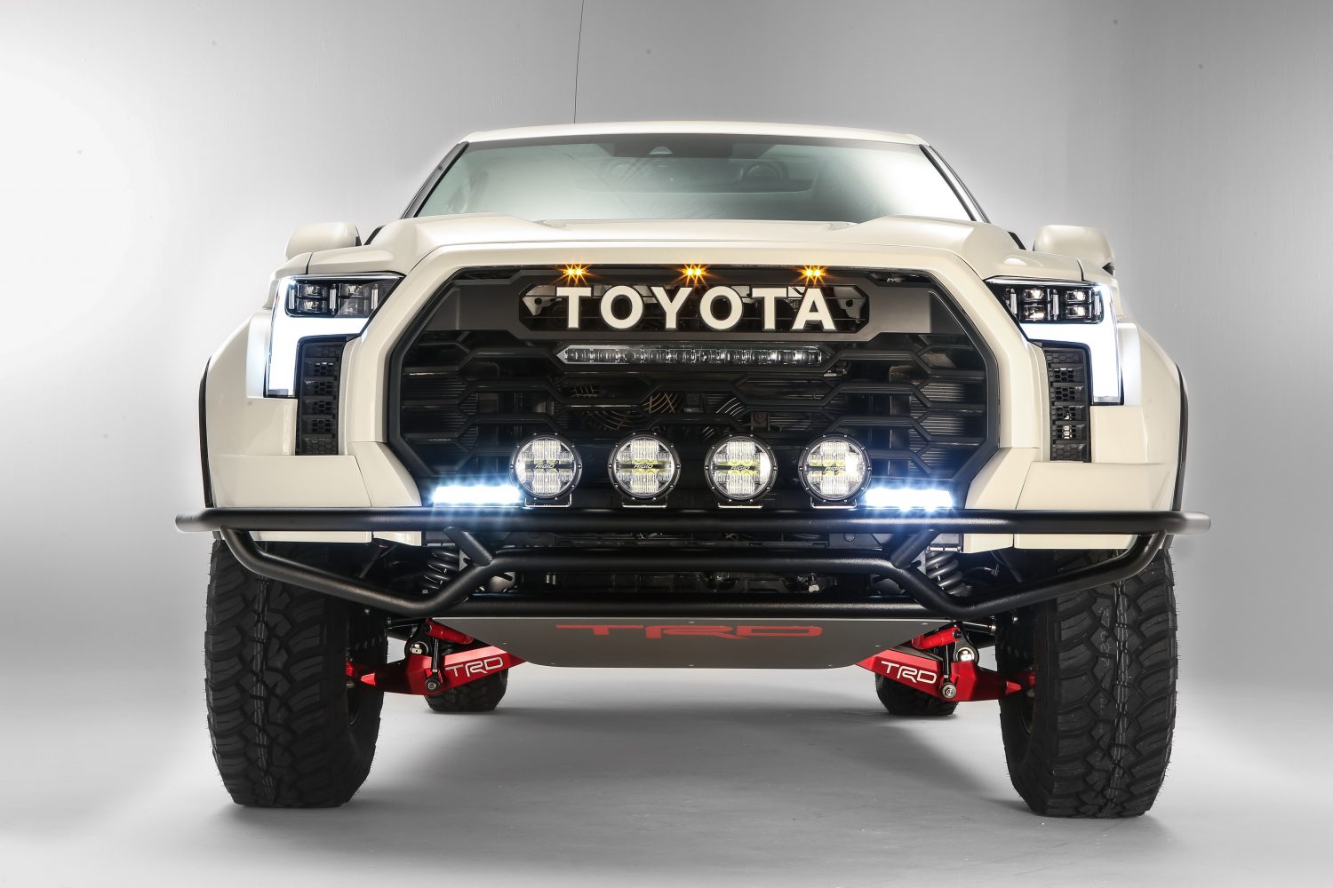 Many off-road races are not daylight-only competitions and often extend into the night, and competitors and support teams cannot enjoy the benefits of closed-course circuit lighting. To illuminate the way during the darkest nights, the TRD Desert Chase Tundra has rear- and side-facing Rigid lights and a front-facing Rigid light bar with room for up to eight lights. The light bar also can be electronically raised when needed and can be lowered below the roof line to eliminate wind noise and help improve aerodynamics.