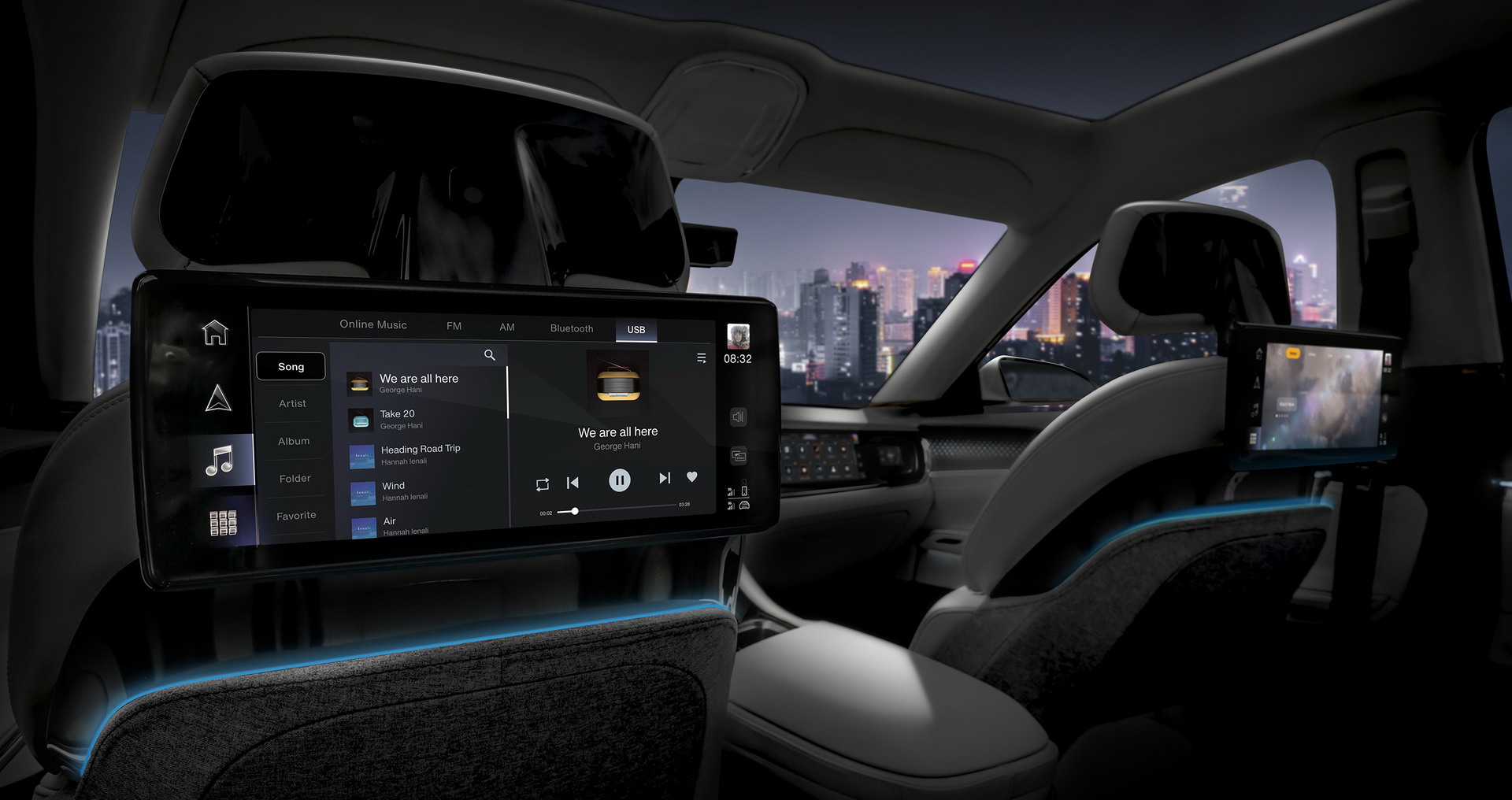 Infotainment screens appear as gloss black sculptures, seamlessly integrating technology within the overall interior composition. Seating uses a unique slim structure that rests on a pedestal base, enhancing comfort and roominess while allowing for maximum legroom, shoulder space and personal storage for each passenger.