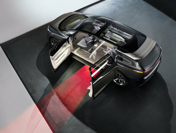 Using this “cinema screen,” which occupies the entire width of the interior, the two passengers in the back row can take part in a video conference together or watch a movie. Even split-screen use is possible. When the screen is not in use, it offers a clear view into the front thanks to its transparent design or – when folded upwards – through the glass roof area to the sky.