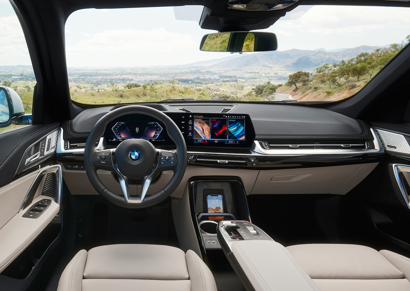 The raised seating position, generous amounts of space which can be utilized in a variety of ways, and a sense of cutting-edge functionality define the driving experience in the new BMW X1. The design of its interior focuses on assured driving pleasure and versatility. Key features of this re-interpretation include the slender instrument panel, which serves as a stage for the BMW Curved Display, and a “floating” armrest with integral control panel.