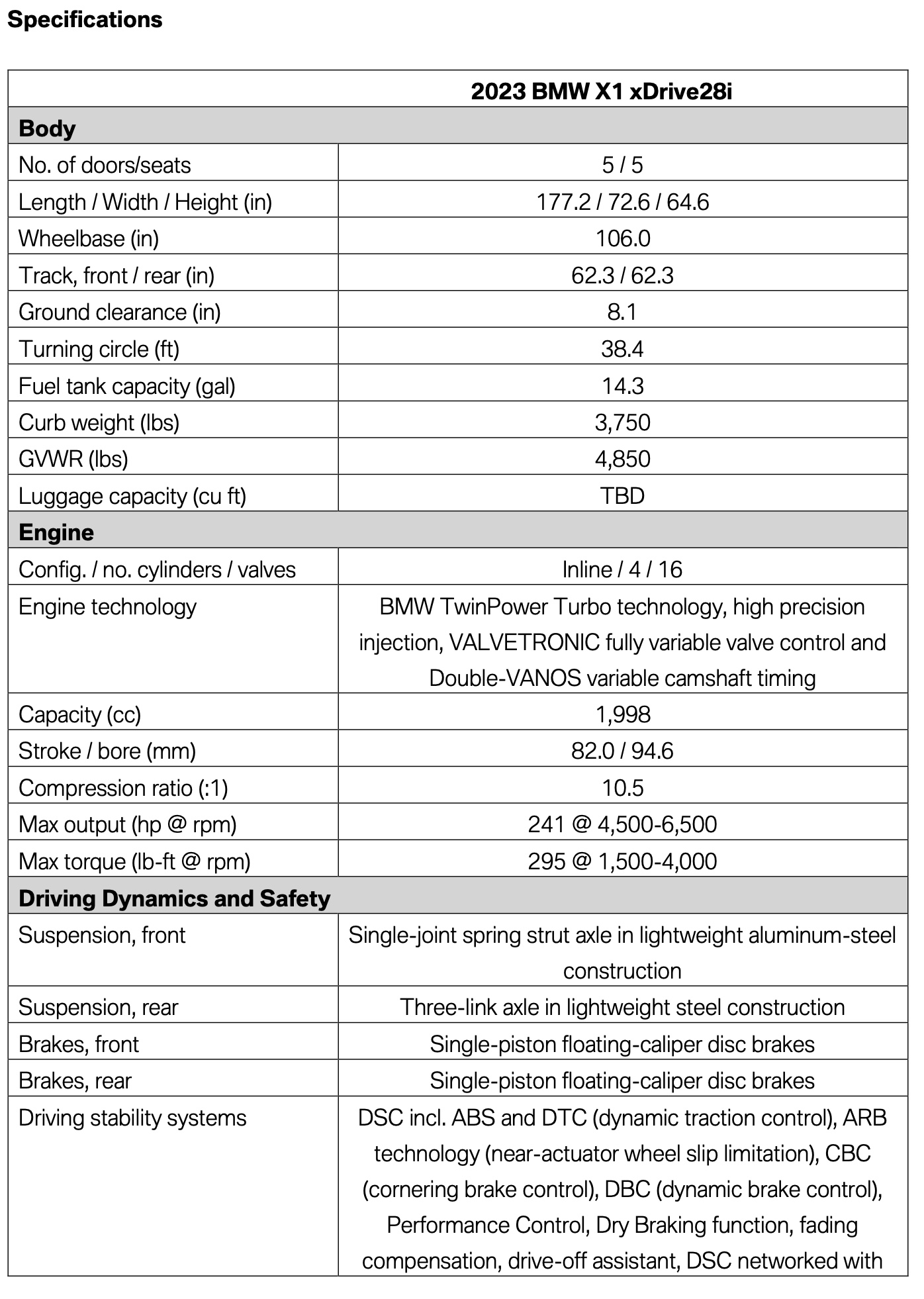 The 2-liter TwinPower Turbo 4-cylinder engine has been revised for 2023. The new engine incorporates a Miller combustion cycle, as well as a new dual (direct and port) injection system and a revised combustion chamber geometry. The engine now makes 241 hp between 4,500- 6,500 rpm, and torque has increased to a substantial 295 lb-ft between 1,500-4,000 rpm. The engine is mated exclusively to a new 7-speed Dual Clutch Transmission (DCT). Together, they send the X1 xDrive28i from 0-60 mph in just 6.2 seconds.