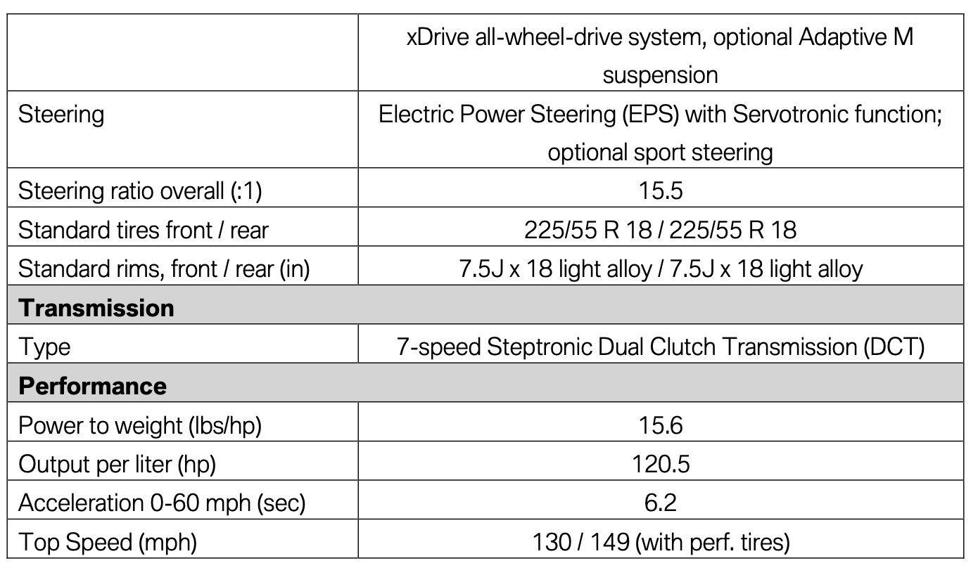 Adaptive M suspension with frequency-selective damping, a 0.6-inch drop in ride height and sport steering.