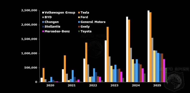 According to a comprehensive report published this morning by research firm Bloomberg Intelligence, Tesla will hold its global crown for EV sales for the next 18 months but will then be usurped by Volkswagen electric vehicles. The full BEV outlook report predicts that many legacy automakers will lag in sales through 2025, but Volkswagen is on track to overtake Tesla’s production volume by 2024.
