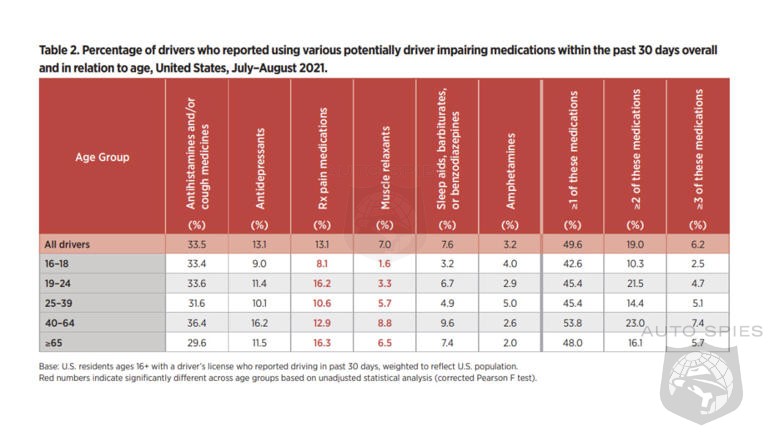 While we accept as fact that some drivers on U.S. roads may taking medications, a new AAA Foundation study found that nearly half of U.S. drivers may be using potentially driver impairing (PDI) medications and, worse, that many of them have no idea that their medications can hamper their ability to drive safely. Nearly 50% of respondents in AAA's study of drivers aged 16 and up admitted using one or more drugs with potentially impairing effects (antihistamines, cough medicines, antidepressants, prescription pain medications, muscle relaxers, sleep aids — including barbiturates and benzodiazapines — or amphetamines) in the past 30 days. "The proportion of those choosing to drive is higher among those taking multiple medications," AAA's brief said. "More concerning, many who took these medications to combat depression, pain, or sleep issues were not warned by their healthcare provider regarding the possible dangerous impact on driving. Many potentially driver impairing (PDI) medications have potential effects that can be dangerous when mixed with driving, including dizziness, sleepiness, fainting, blurred vision, slowed movement, and attention problems," it said.