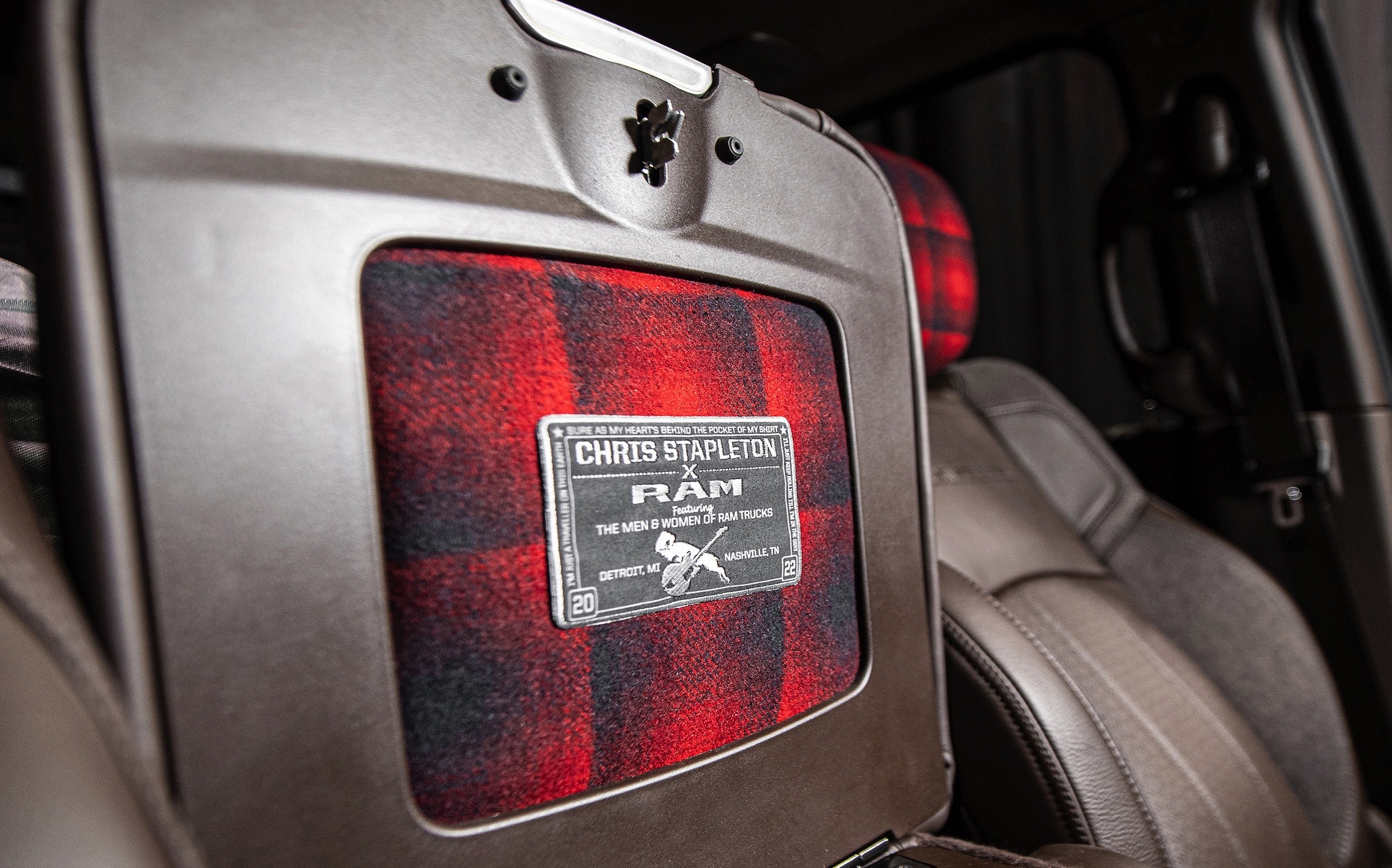 Working with the Ram Truck design team, the “Traveller” truck features custom exterior and interior design cues that nod to the vintage nature of Ram trucks from the late 1970s and 1980s combined with modern cues of today. ??On the exterior, styling cues stem strongly from a Stapleton favorite, the 1979 Ram Palomino truck, evoking the essence of the iconic vehicle and updated with a contemporary and modernized design. The Palomino-inspired exterior colors Linen Cream, Radar Red, Bison Brown and Cashmere, have been modernized to complement today’s finishes. In addition, the iconic striped graphics featured on the Palomino are adapted to fit the more sculptural 2500 Heavy Duty body. Retro-inspired Turbo Fin 18-inch wheels set the aesthetic tone of the truck blending the nostalgic classic 80’s appearance and updating the style with a fully painted, deep-dished machined-faced wheel with a bright chrome center cap. Influenced by the classic Ram 1980s badge fonts, the “Traveller” badging merges the past and the present to create a distinct look. Finishing the exterior is a multi-faceted, three-dimensional Ram hood ornament added to achieve a vintage, yet modern day appearance. ??The interior of the Ram “Traveller” truck features numerous personal design details, unique colors, textures and materials that pay homage to Stapleton’s musical career journey while representing his individual style. These details also serve a practical purpose for his everyday lifestyle. A custom, monochromatic Bison Brown color is featured throughout the entire interior palette with a pop of color integrated into the headrests of buffalo plaid flannel material, an identical material as the jacket worn by Stapleton on the cover of his debut album, Traveller. Walnut Burl wood appears throughout the cabin along with tailored cloth wrapped seats, speaker grilles that draw inspiration from guitar amps and a custom front-row bench seat. Completing the design is a customized Chris Stapleton signature inlaid into the wood of the instrument panel as another personal touch.