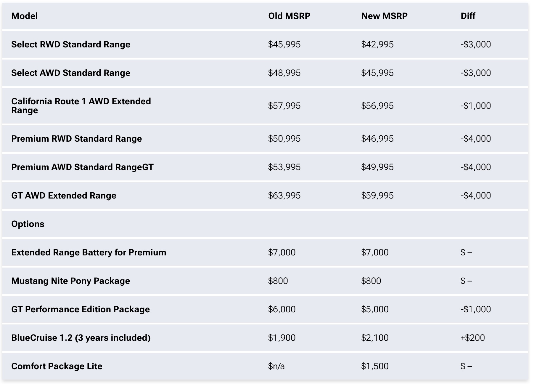 The latest price reductions mean the entry level RWD Standard Range Mach-E starts at $42,995 (down $3,000), but the biggest savings to be made are on the Premium Standard Range models and the Mach-E GT, which drop by $4,000. Those reductions bring the price of a Premium RWD down to $46,995, the AWD version of the same to $49,995, and reduce the cost of a GT from $63,995 to $59,995.