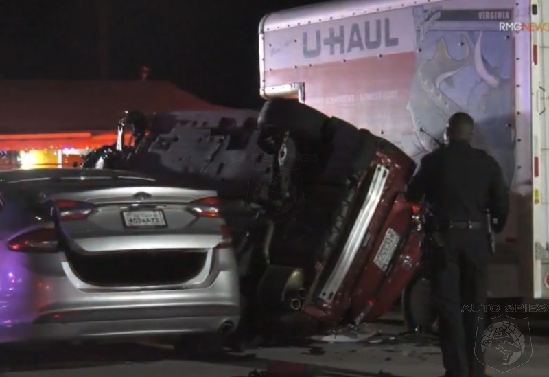 Much of the crash wasn't visible from the security cameras, but the sounds of the crash could be heard. A car, seemingly going through the nearby traffic light, lost control and crashed into a car parked in the parking lot. Two onlookers nearby were able to get out of the way in time. Then, one person was seen flying out of the car, over a U-Haul truck parked nearby, and into the parking lot.