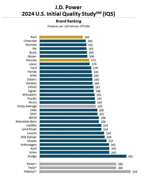 Ram is the highest-ranking brand overall in initial quality with a score of 149 PP100. Among mass market brands, Chevrolet (160 PP100) ranks second and Hyundai (162 PP100) ranks third.