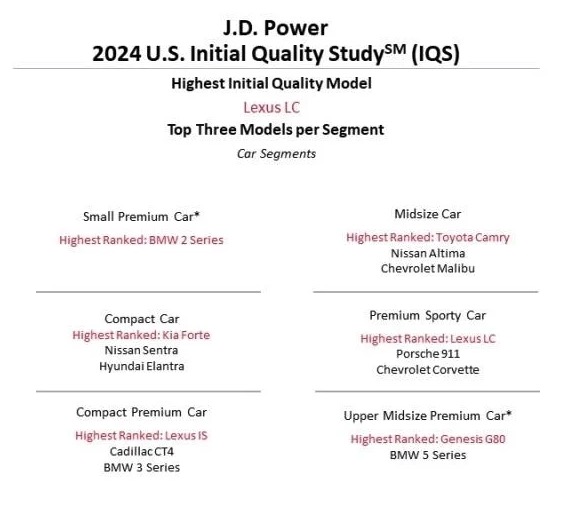The U.S. Initial Quality Study, now in its 38th year, is based this year on responses from 99,144 purchasers and lessees of new 2024 model-year vehicles who were surveyed after 90 days of ownership. For the first time, the study additionally incorporates repair visit data based on hundreds of thousands of real-world events reported to franchised new-vehicle dealers. The methodology for this year’s IQS was enhanced to unite newly acquired, state-of-the-art vehicle repair data with traditional J.D. Power VOC data while fielding continuously year-round. This enhanced IQS data allows automakers the ability to quickly identify potential issues before they become bigger problems in the quality landscape.