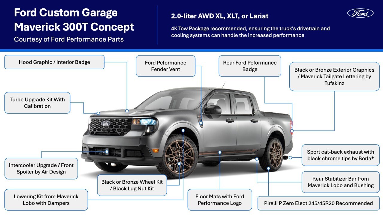 Ford has transformed the compact Maverick pickup into a 300-horsepower beast, and it's dominating SEMA 2025. The Maverick 300T is packed with Ford Performance Parts, featuring a turbo from the Mustang’s 2.3-liter EcoBoost, upgraded suspension, and striking 20-inch bronze wheels.