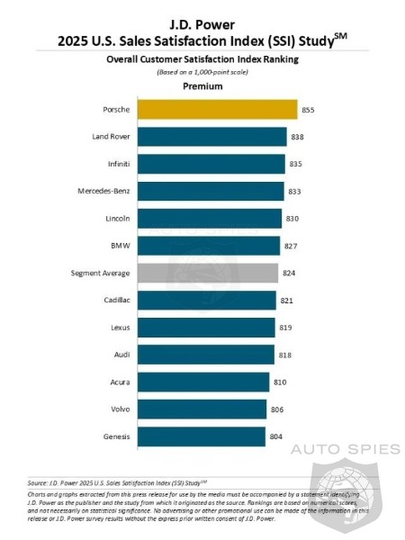 Porsche ranks highest in sales satisfaction among premium brands for a third consecutive year, with a score of 855. Land Rover (838) ranks second and Infiniti (835) ranks third.