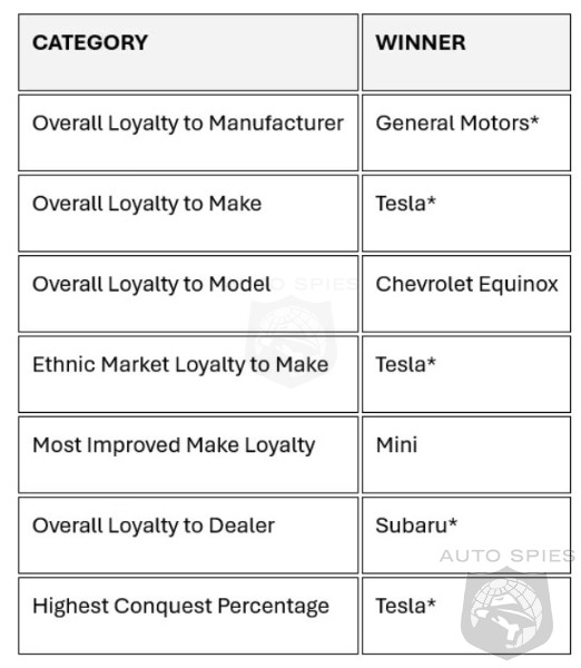 General Motors received the ‘Overall Loyalty to Manufacturer’ award for the 11th year in a row. Tesla was the recipient of the ‘Overall Loyalty to Make’ award for the fourth consecutive year.
