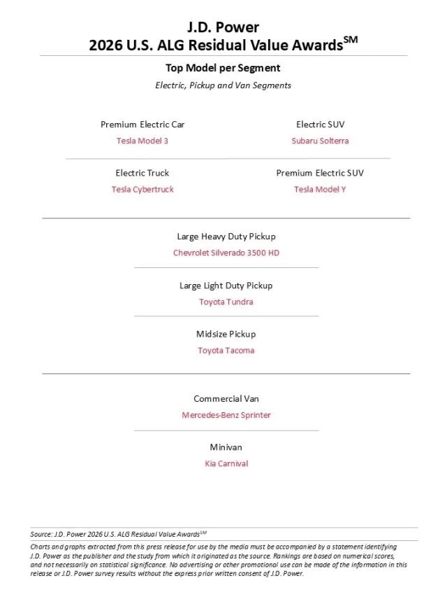 In a market where affordability pressures are pushing more customers to weigh the total cost of vehicle ownership, the estimated worth of a vehicle at the end of its lease term, known as a residual value, is a key indicator of long-term resale value and affordability. The J.D. Power 2026 U.S. ALG Residual Value Awards,SM released today, highlight the importance of residual values, with Tesla and Toyota showcasing the strongest results.