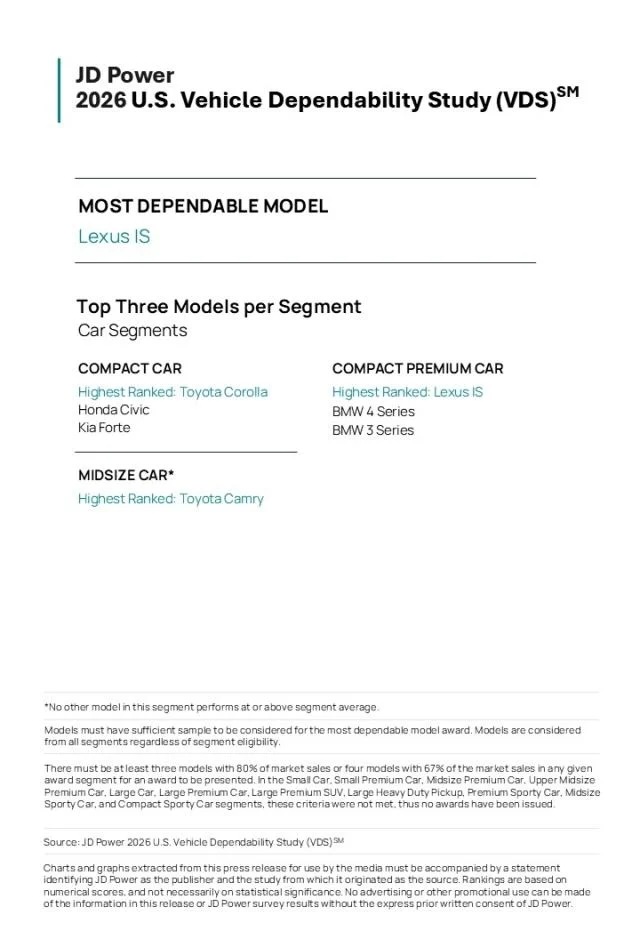 Toyota Motor Corporation has the top overall model in the study—Lexus IS—and receives the most model-level awards with eight. Model-level award recipients are Lexus IS, Lexus UX, Lexus GX, Toyota Corolla, Toyota Camry, Toyota Tacoma, Toyota Sienna, and Toyota 4Runner. General Motors Company receives four model-level awards for Buick Enclave, Cadillac XT6, Chevrolet Equinox, and Chevrolet Tahoe.