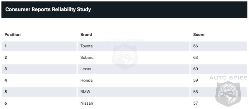 At the top of the pile, Toyota grabbed first place with Subaru second and Lexus third. Honda and BMW rounded out the top five. Consumer Reports based the study on survey data covering about 380,000 vehicles, so this is the kind of league table that has credibility, and isn’t just the result of an angry guy yelling into a forum thread about his rogue SUV.