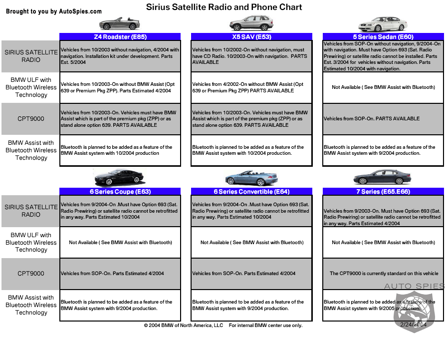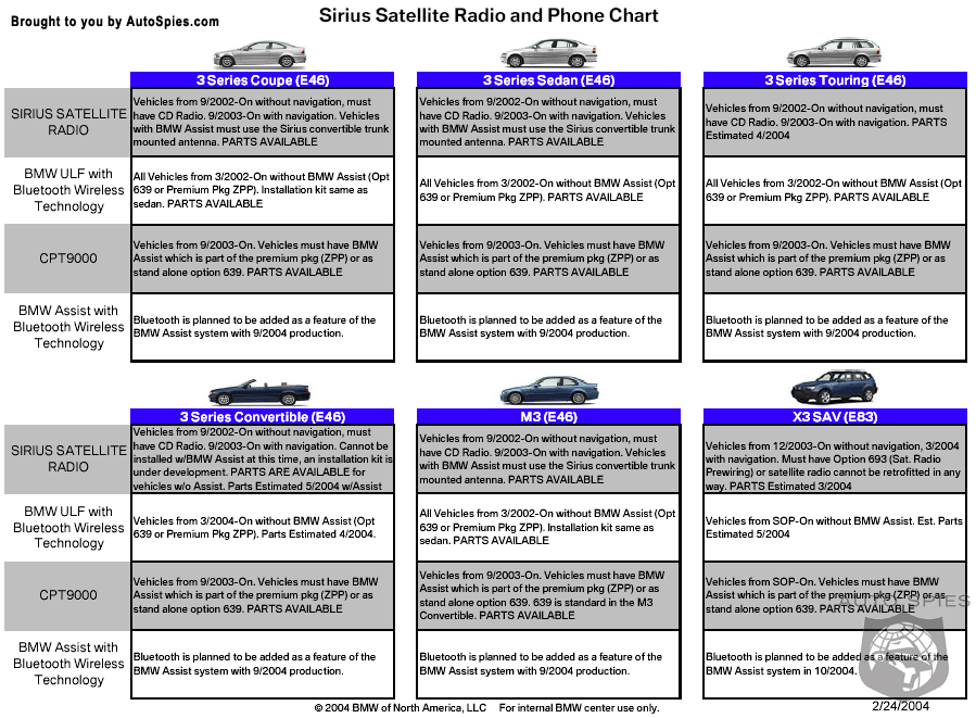 Want to make your life miserable?Call any BMW and try to get a straight answer about getting a Sirius radio installed in your existing BMW or a new one…There’s more fine print and ambiguity to explore than the Alan Dershowitz law briefing on the OJ trial!So after days of research and numerous reasons to take multiple Advils, we found a document that actually cuts through all the riffraff.Why doesn’t BMW make this document public to everyone?That would make TOO much sense!It took our parts guy about 15 minutes himself to find it on the internal BMW dealer website “Centernet” (https://www.bmwcenternet.com/) .And he almost didn’t because it’s buried about a thousand levels deep.Well, here you go, the best guide for understanding Sirius radio on your BMW…Another mission accomplished for you by the Auto Spies!Enjoy!p.s. If anyone has a usable username and password to Centernet….well :)