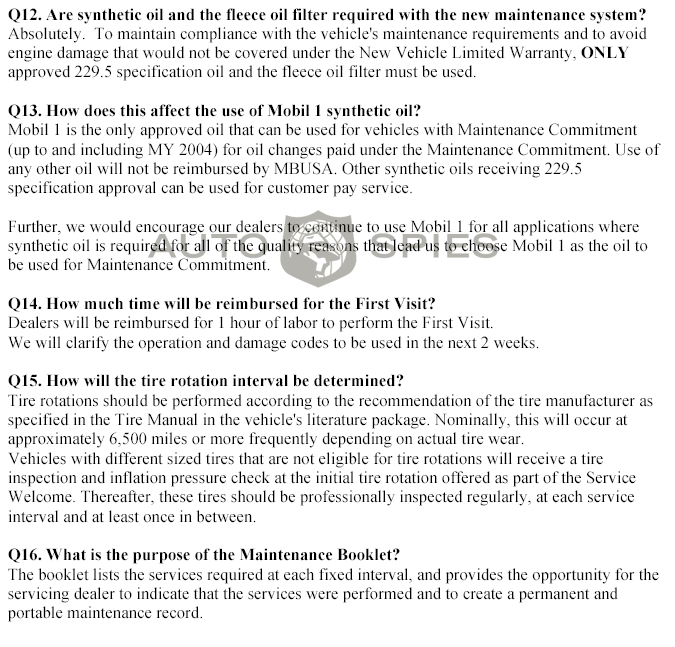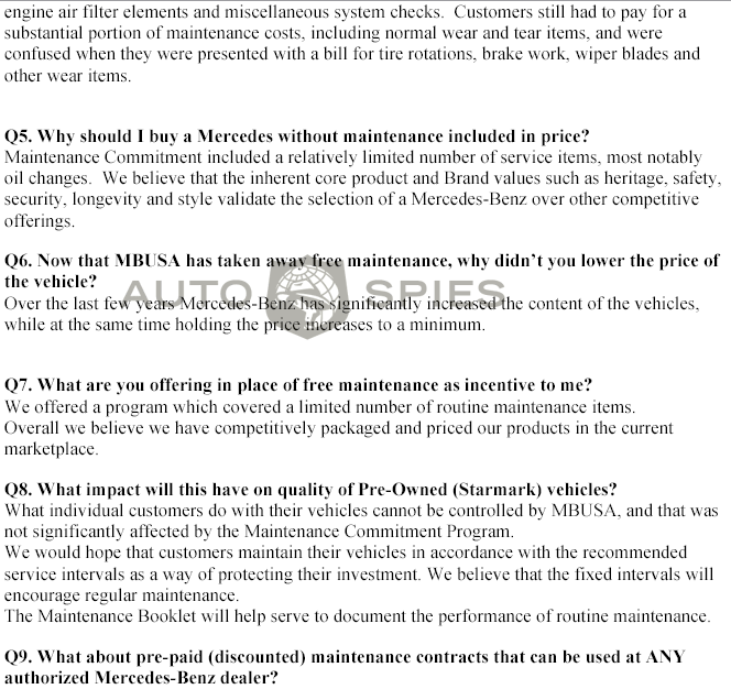 As you know, we broke the story a few weeks ago about MB dropping free maintenance in 2005 models.We even got you the brochure to prove it.This week, we have the next installment...The official Q&A from MB that will be sent to dealers in order for them to be able to clearly communicate the message to MB owners...