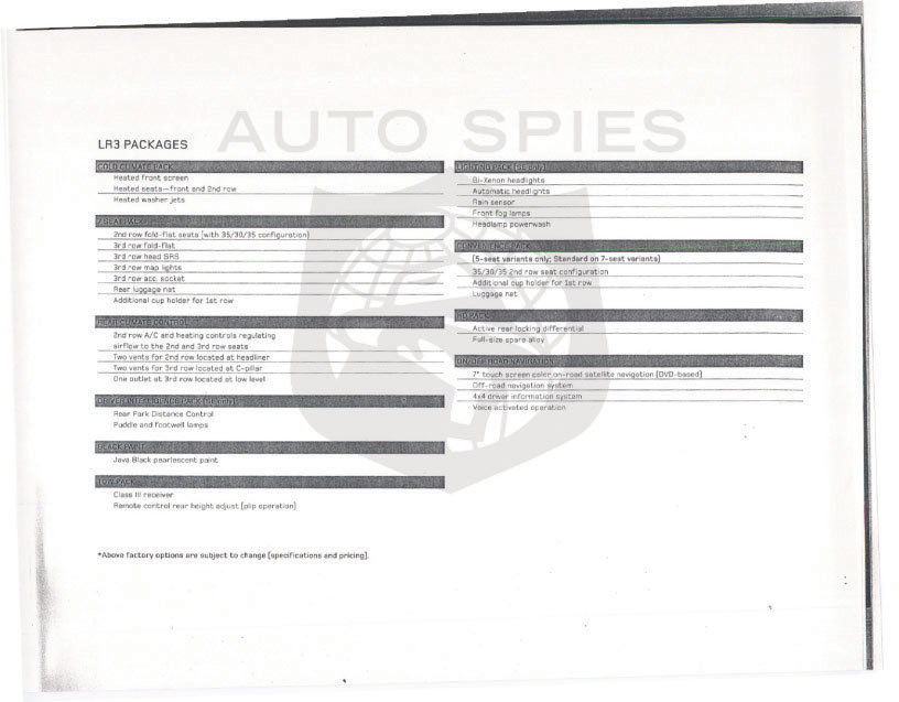 Dear 001,Boy...this was a close one!I thought the guard saw me stuffing this under my raincoat but I got out unscathed!I figured your readers would dig this...It's the REAL internal spec/options list for the hot new Land Rover LR3!My sources tell me dealer pre-order lists are filling fast and they will be hard to get, if you don't get your name on a list SOON!The rumor at one dealer in Southern California is they already have 75 deposits in hand and they will only get 25 units on their first allocation.And when you look at how it stacks up in the specs against the competition, I can see why!Check it out below...Catch you later,Dundee